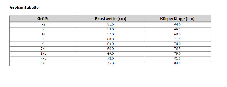 • Größen: XS, S, M, L, XL, 2XL, 3XL, 4XL, 5XL (Farbe schwarz + Navy)