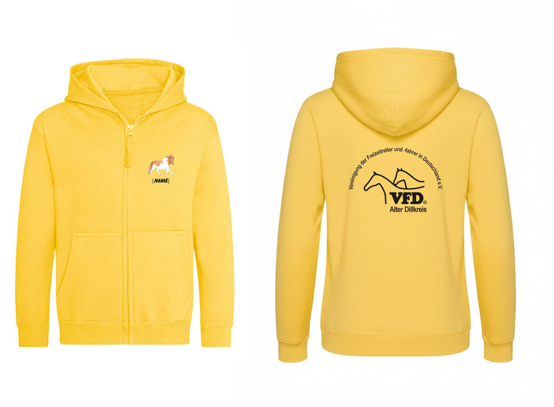 Bequeme und komfortable Zip Jacke für Kids, liebevoll bedruckt mit Logo des VFD Alter Dillkreis e.V. auf dem Rücken und zusätzlich mit einer Pferde-Zeichnung auf der Brust.