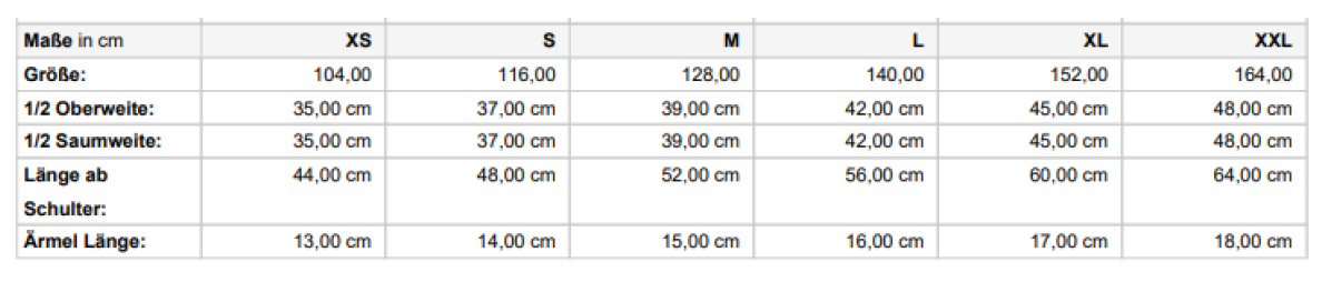 - Größen: XS (98/104), S (110/116), M (122/128), L (134/140), XL (146/152), XXL (158/164)