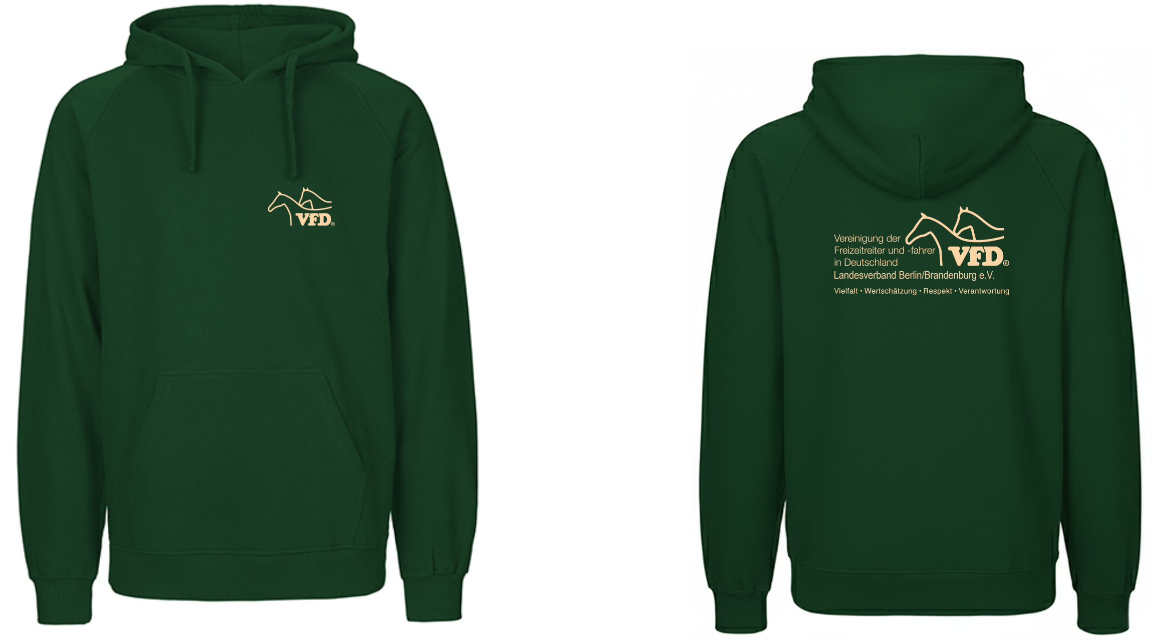 Bequeme und komfortable Hoodies, liebevoll bedruckt mit den Logo des VFD e.V. auf der Brust und LV Berlin-Brandenburg auf dem Rücken. Perfekt für Ausflüge bei kühlen Wetter oder auch einfach zum rumlümmeln mit einer heißen Tasse Kakao. Der Hoody für Frauen ist in verschiedenen Farben erhältlich. Er ist bequem, stylisch und perfekt für einen lässigen Look. Ideal für kühlere Tage oder einfach zum Wohlfühlen. • Da Ihr Produkt individuell personalisiert und veredelt wird, benötigen wir ca. 14 Tage bis zum Versand. Meistens klappt es aber früher. Ursprungsland: IndienVeredlung: Druckecke® Zertifizierung: Fairtrade-zertifizierte Baumwolle, Bio-Baumwolle, Faire Arbeitsbedingungen, Oeko-Tex 100, SA8000/ EU-EcolabelOEKO-Tex: OEKO-TEX® Standart 100: 2023OK2311 AITEXGrammatur: 300g/m² Material: 100% Baumwolle Farbigkeit: 1-farbig/ Pastell/ MeliertGrößenlauf: siehe Größentabelle (Bild)Pflegehinweis: 40°C waschbar/ Trockner geeignet/ Bügeln erlaubtPassform: Regular (normal geschnitten)Verarbeitung: gekämmte Baumwolle/ Innen angeraut/ Seitennähte/ mit Kapuze und Känguru-BeutelÄrmel: Raglan/ mit BündchenFarben: Bottlegreen, Beige Größen: XS, S, M, L, XL, XXL Farbliche Darstellung/ Abbildung kann je nach Bildschirm abweichen!